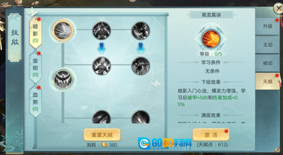 天赋主要可划分为三大类别,分别是:暗影、金刚以及血煞。