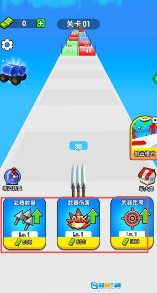 1. 在每关开启之前,可从武器数量、伤害、距离等技能方面挑选提升的方向,进而启动闯关任务。
