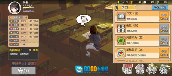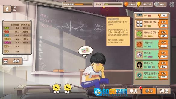 3)完成课程学习后,关注“安排”里的“学习”与“娱乐”项目。在确保父母满意度和自身压力都不超标的前提下,通常安排3至4项学习活动、2至3项娱乐活动,且娱乐活动最好专门挑选能提升魅力值的。(务必设置“学习”活动,否则后续可能因面子值不够而无法兑换黄冈密卷。)