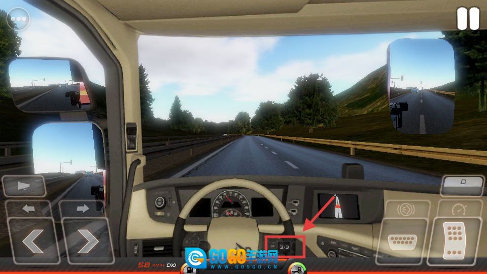 4、驾车过程中留意【3/3】档位,依据导航指示,平稳操控卡车运送货物。