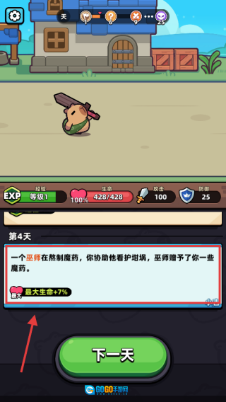 1、在第【4】天的时候,协助巫师,可获得【最大生命 - 加 - 7%】的增益效果。点击【下一天】,推动游戏进程,从而开启后续的冒险事件。