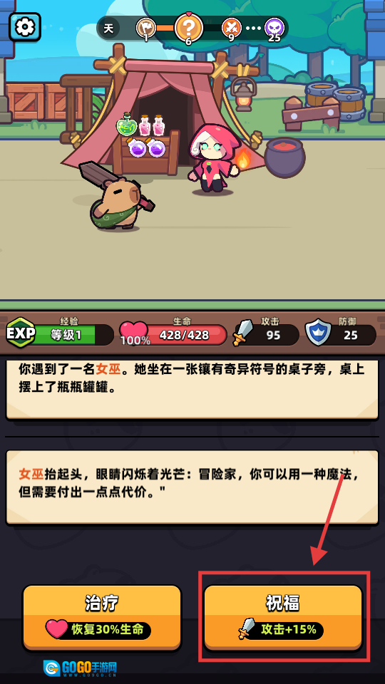 2、倘若遇到女巫,选择【祝福-攻击-加-15%】,此选项虽需付出一定代价,但能提升输出,增强战力。