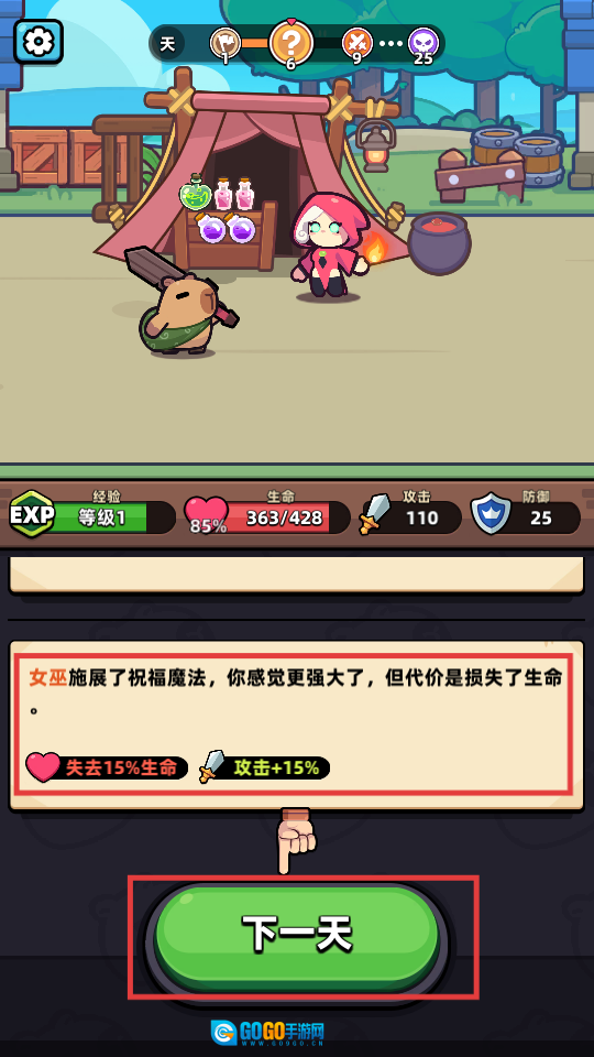 3、送出祝福后,获得【失去15%生命 - 攻击 + 15%】的效果,点击【下一天】,凭借攻击加成去挑战后续内容。