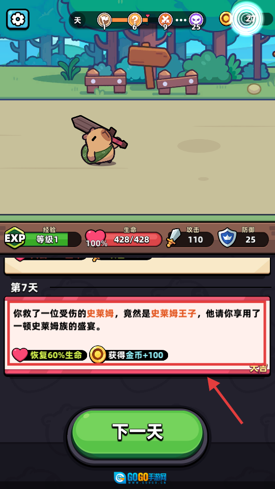 4、在第【7】天拯救史莱姆王子,可获得【恢复60%生命 - 金币 + 100】,接着点击【下一天】来积累资源。