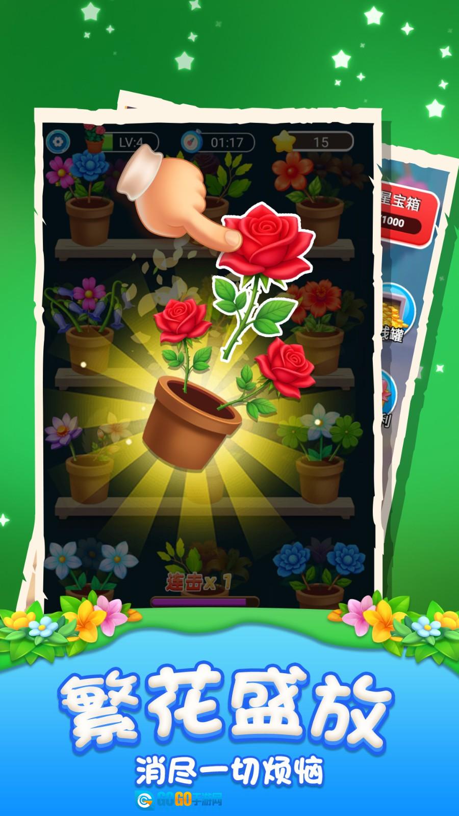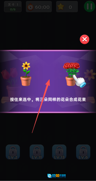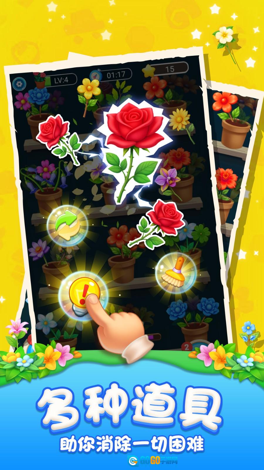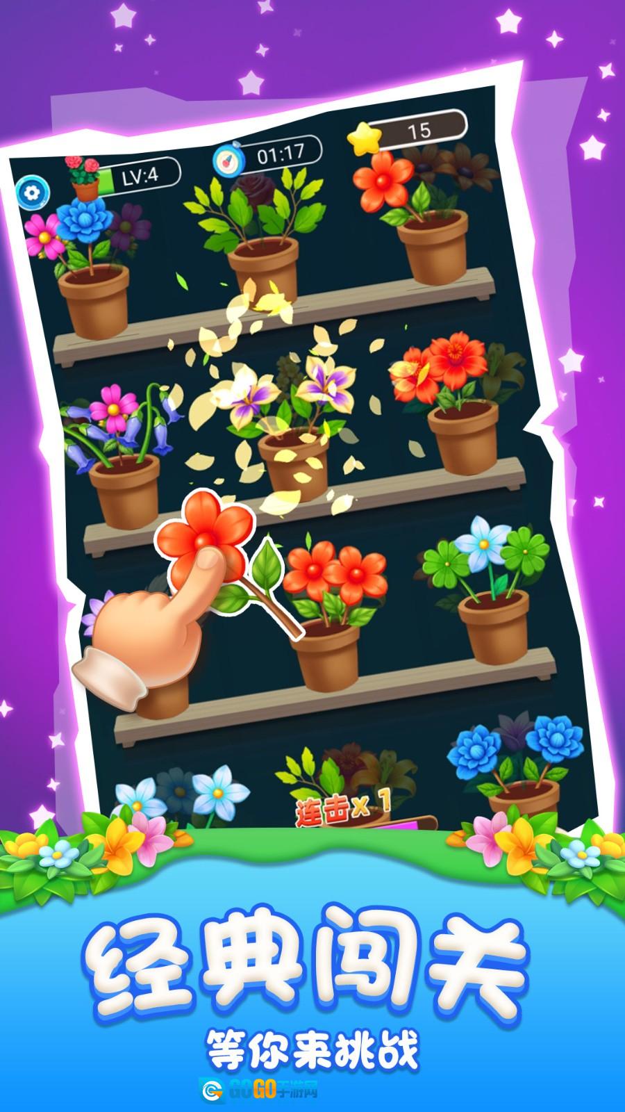 1. 玩家只需拖动相邻的花朵,让它们交换位置。一旦在横向或纵向形成三个及三个以上相同的花朵,就能触发消除效果,同时该消除操作会计入得分统计当中。