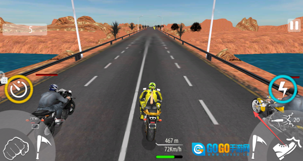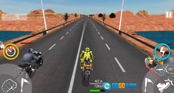 1. 灵活操控摩托车,巧妙躲避赛道上的重重障碍,适时运用加速技能,突破自身极限。此外,还能通过攻击按钮,对其他选手进行干扰。