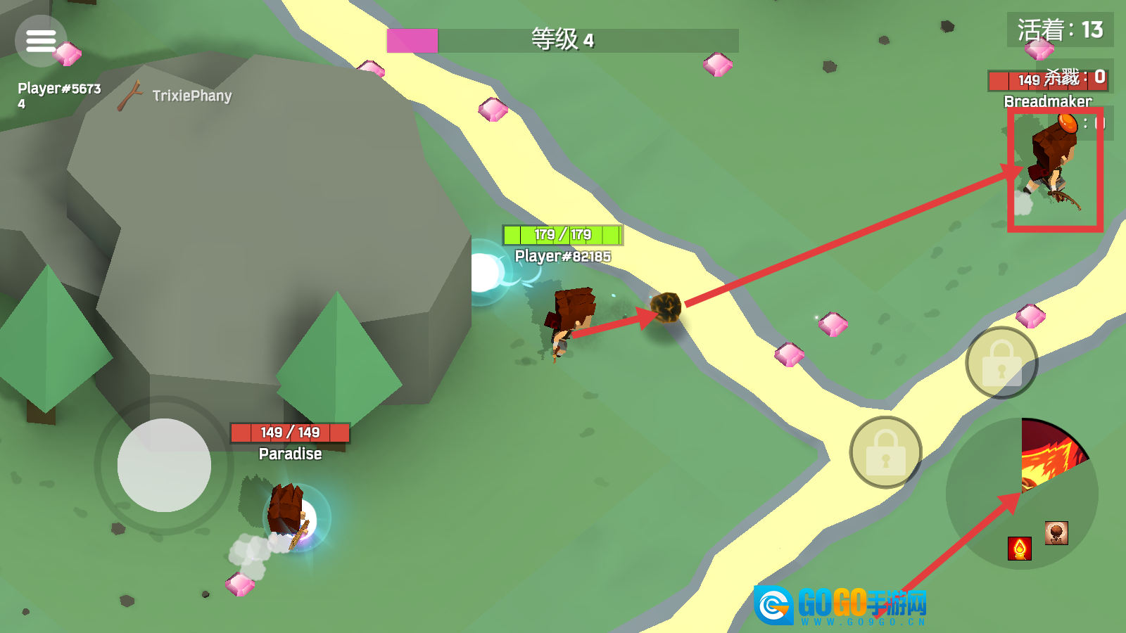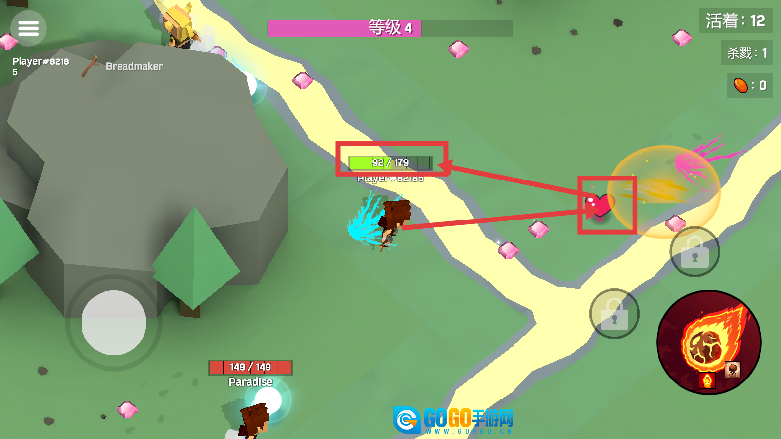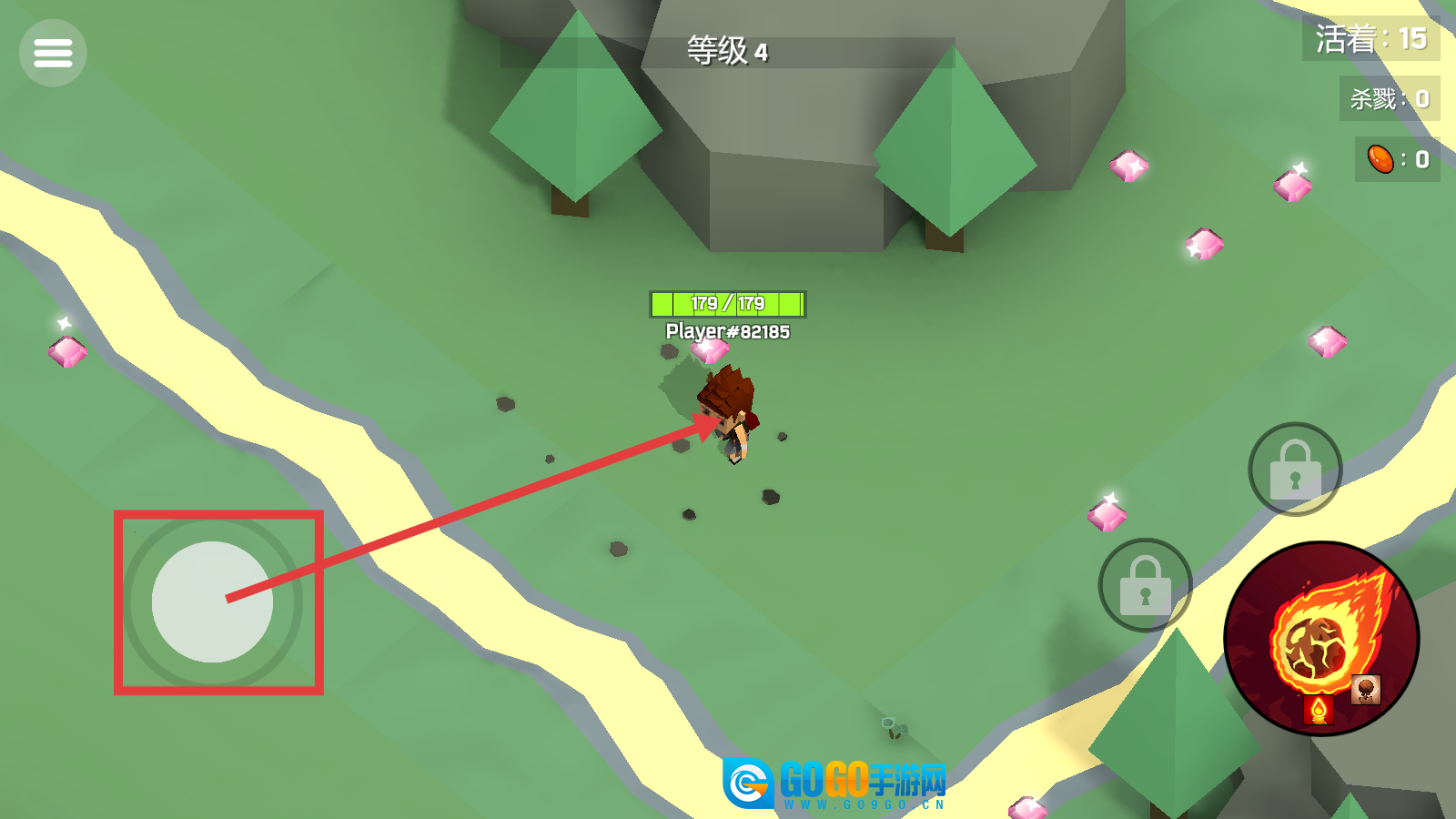 1. 通过操控左侧摇杆来移动角色,于等级4的地图里收集粉色宝石,同时留意“活着”与“杀戮”的计数情况,并对地图环境加以熟悉。