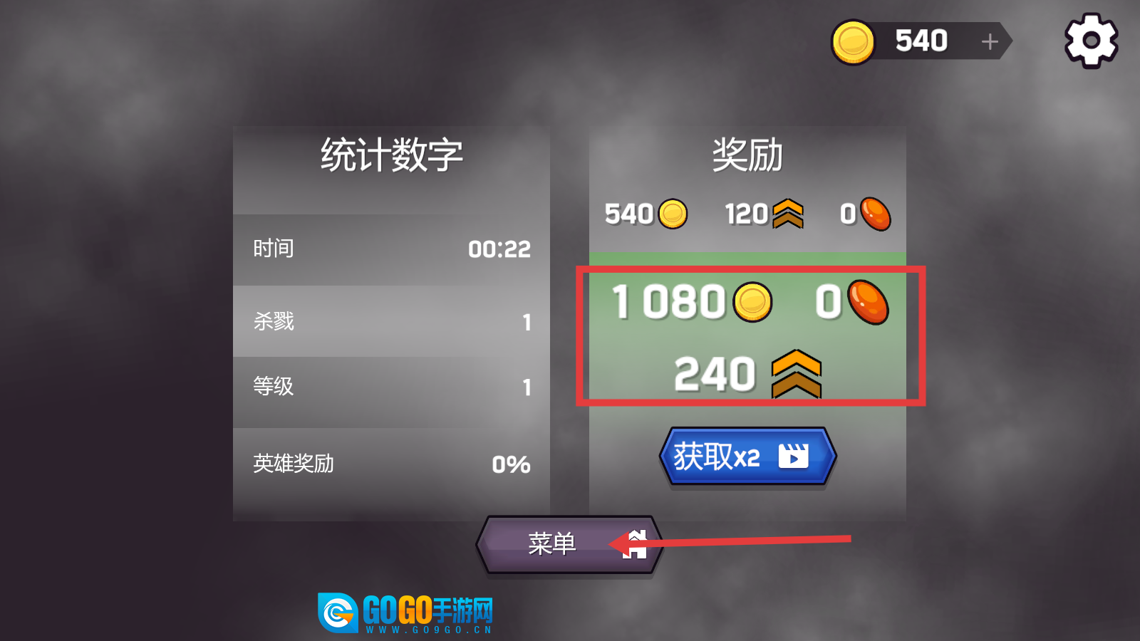 4、当战斗结束,可领取1080金币与240等级的资源,随后点击“菜单”按键回到主界面,通过积累资源来增强角色的战斗力。