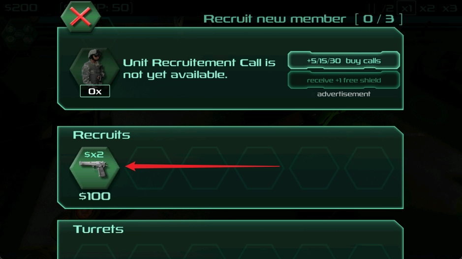 3、轻点界面上的圆圈区域,即可购买士兵与装备。