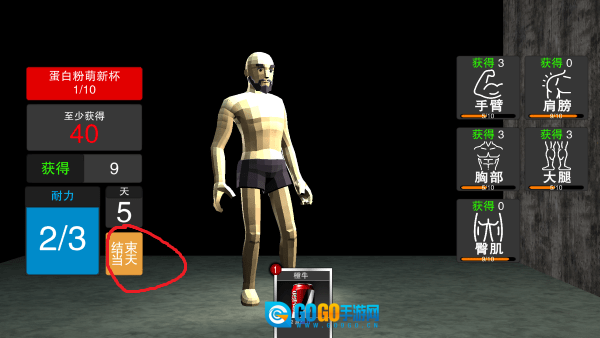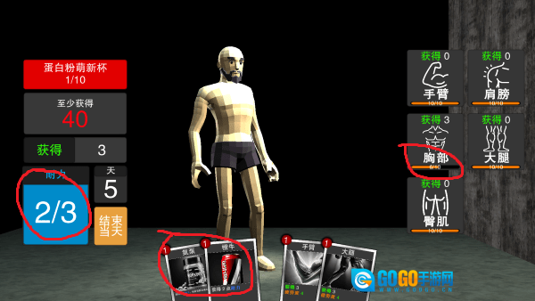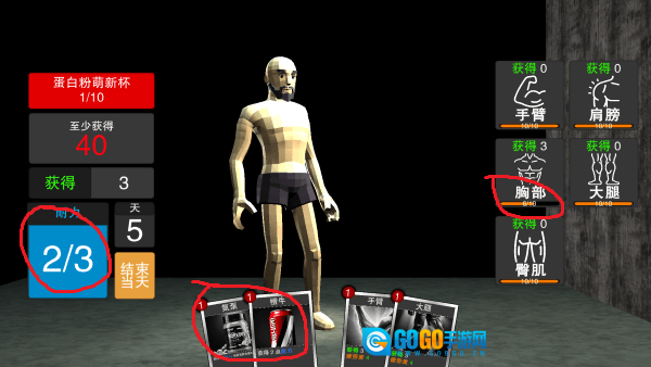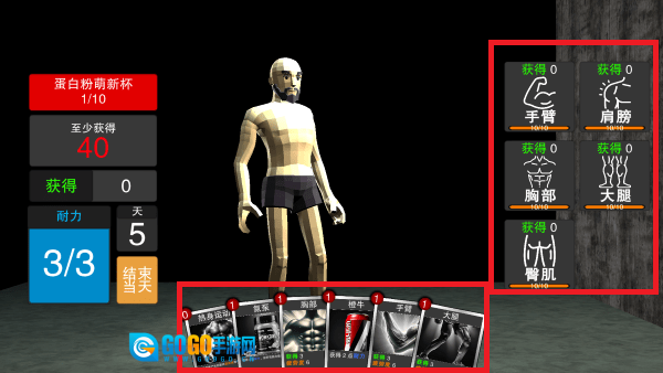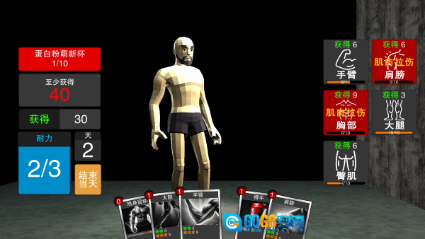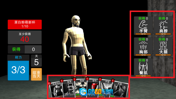 在下方,你能瞧见锻炼的卡牌,而右边则是各个锻炼部位对应的数值,注意别将其全部消耗殆尽。