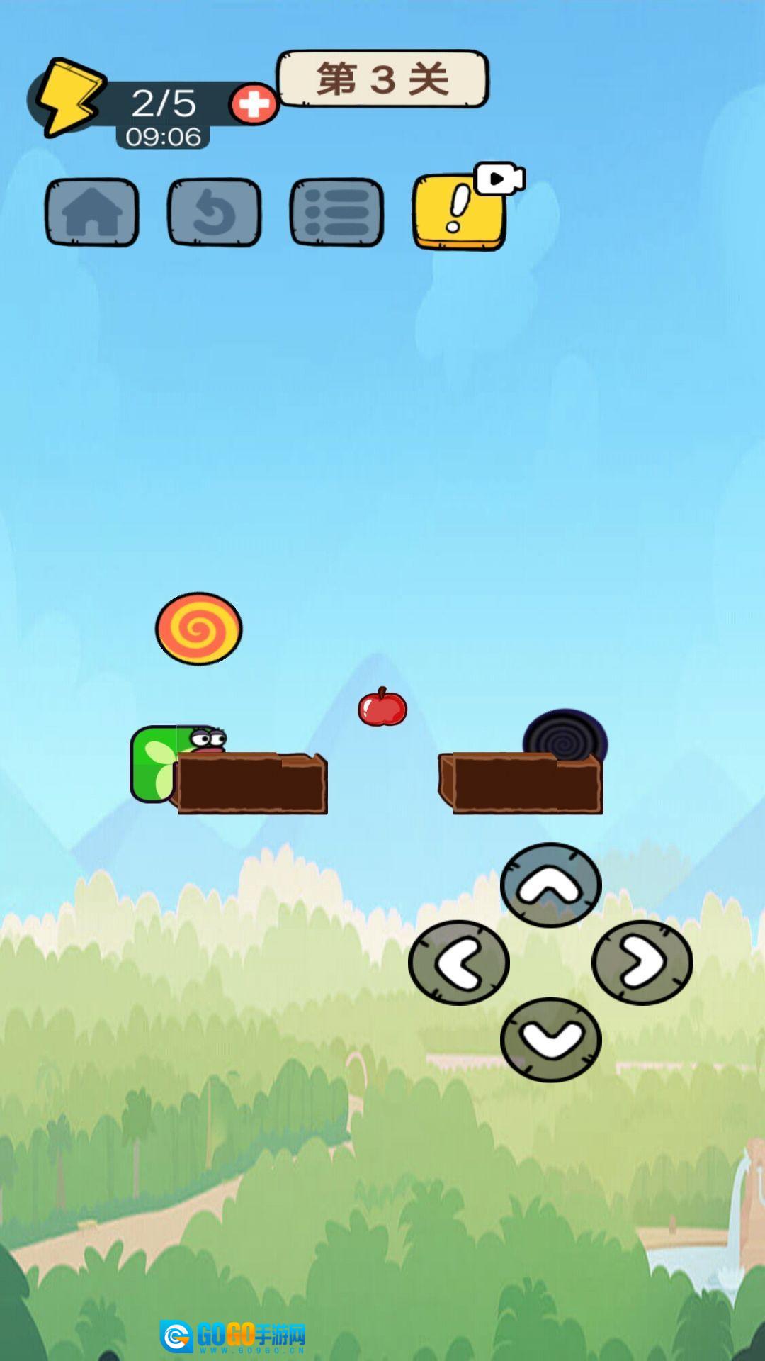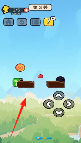 2、在第3关中,通过虚拟按键来操控绿色蛇形角色(箭头所指方向),使其避开障碍(如苹果、轮胎),并收集糖果。