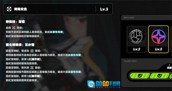 其次是雅的特殊攻击“深雪”,它和比利的技能方式相同,都是向正前方直线区域内的敌人发动冰属性斩击。而且,这个特殊技能还能强化为“花弁雪”。当能量值充足时,可直线施展冰属性斩击,此招式发动后角色进入无敌状态,并获得一点魔刃值。