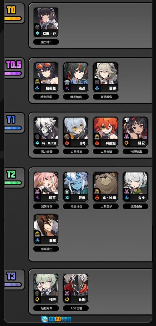 T0.5:紧跟T0梯队之后,此梯队角色自身强度颇高,只是未必契合当前版本,但依旧能够充当阵容搭建的核心。