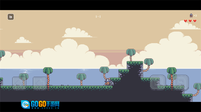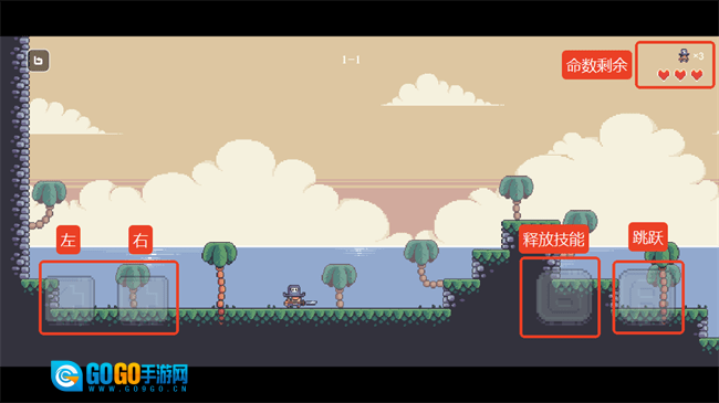 2. 熟悉基本操作,左下角用于方向控制,右下角分别对应技能释放与跳跃,右上角能查看剩余命数。