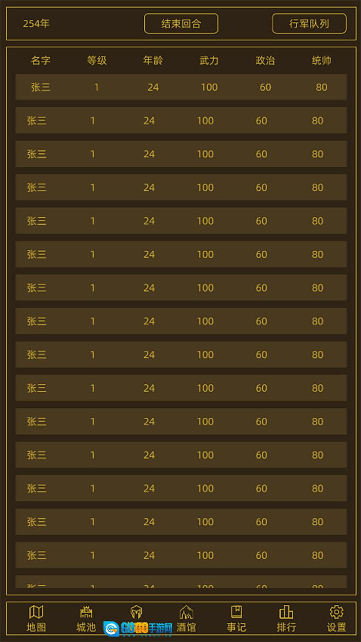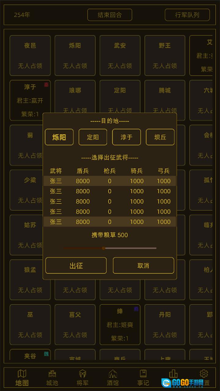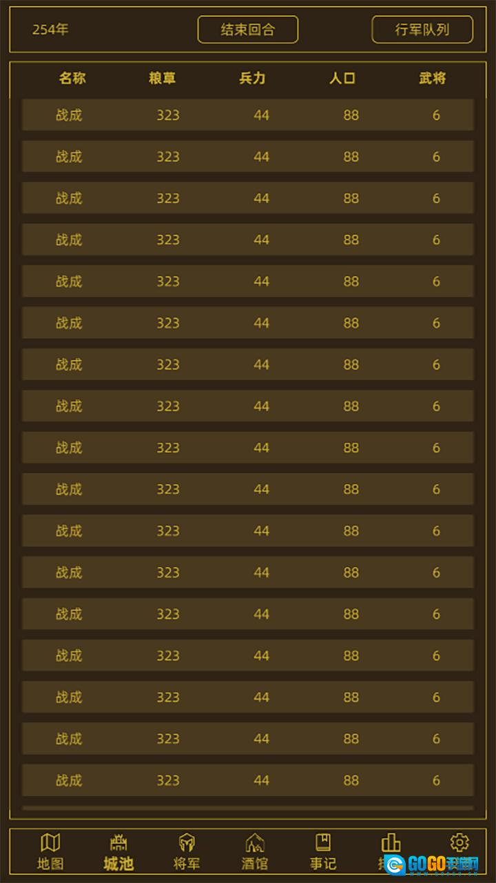关键技术在于理财,采用50银抽取的方式,这样的配置勉强能用。人口城就无需再投入精力去养了。一旦人口达到一千,便将其征调补充进大部队。当民心达到80以上时,就进行征收。粮食始终处于短缺状态,君主最好刷出内政属性高的,且不要变动。若粮食呈负增长,武将每个回合会减少5点生命值。