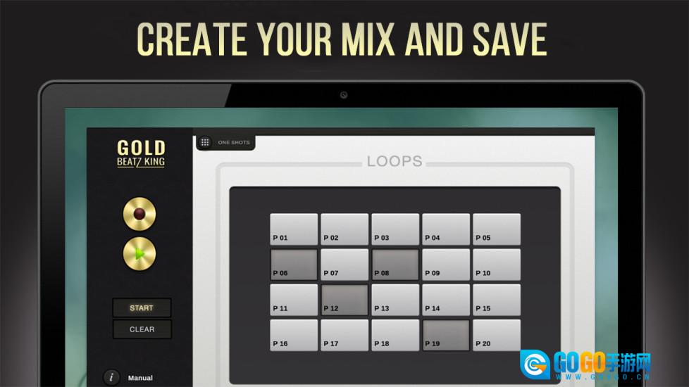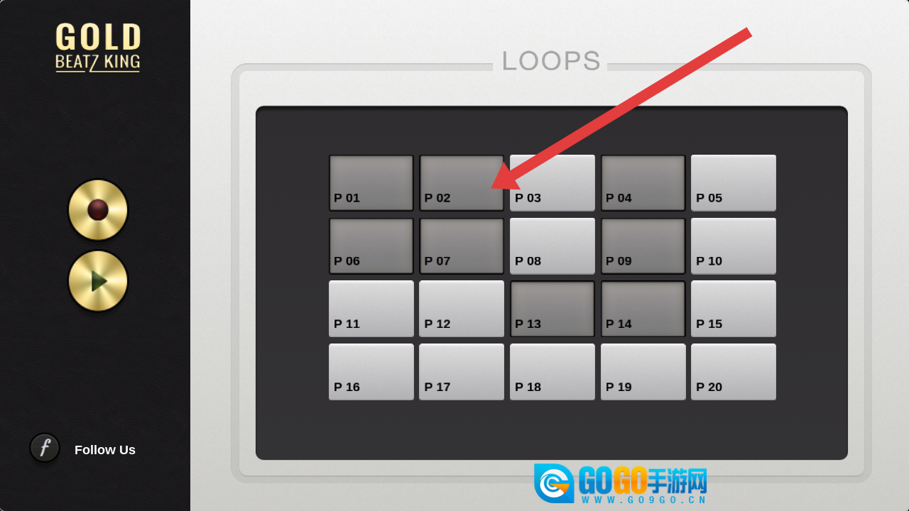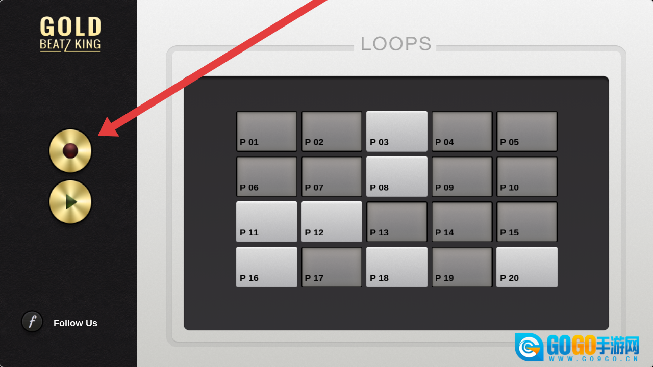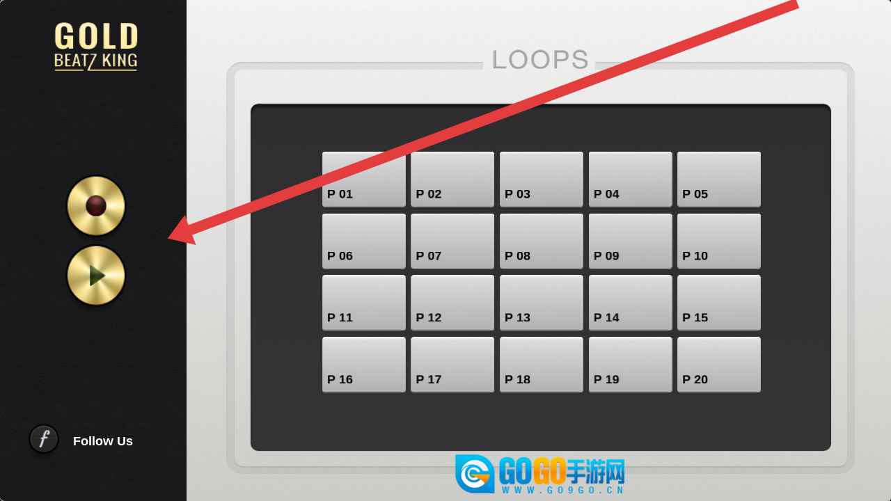1. 来到曲目列表界面,在左侧的金色按钮里,红色的是录制键,绿色的是播放键。点击P01 - P20中的任意一个曲目方块,即可开启节奏循环创作。