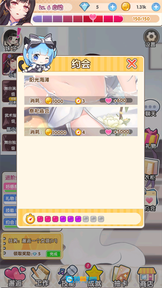 约会场景丰富多样,涵盖阳光海滩、祭祀庙会等。在约会过程中,消耗金币以及时间道具,就能获取大量好感度。