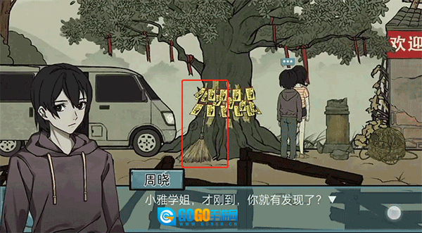 1. 下车之后,行至村口,与小雅进行交谈,然后在大树旁拾取【扫帚】