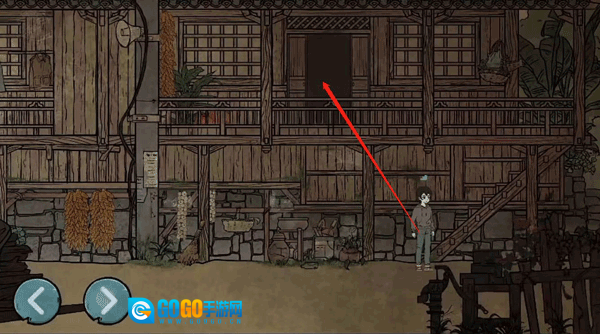 3、往右边走,抵达住所。交谈结束后,走到右侧竹梯旁,顺着竹梯上楼。