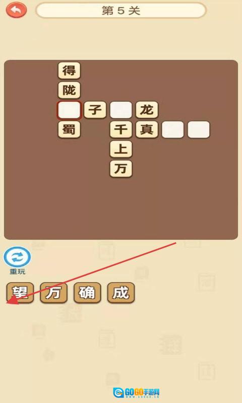 1. 来到“第5关”,留意棋盘上的空格,从下方挑选合适的字(比如“望”),将其填到对应的位置,从而拼出完整的成语(像得陇望蜀之类)。