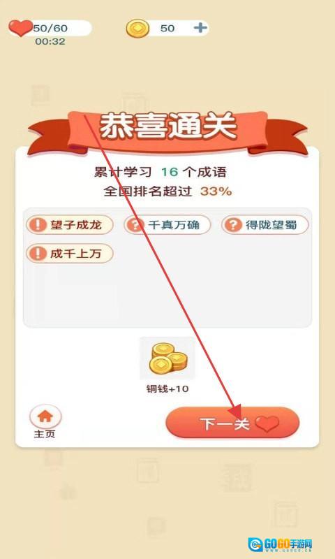 2. 成功通过关卡后,点击“下一关”按钮,即可进入新的关卡。在持续闯关过程中,不断累计学习成语,借此提升在全国的排名,同时还能获取铜钱奖励。