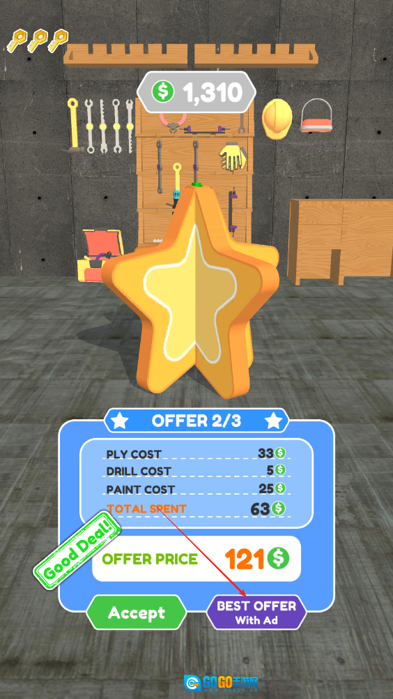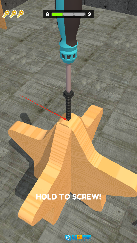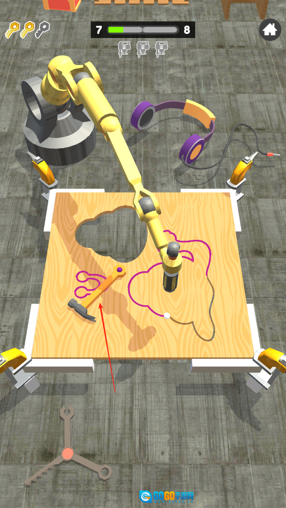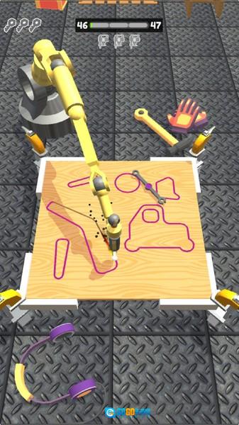 1. 游戏开局后,使用切割器把木板模型切割出来。切割过程中,要留意木板中间不断转圈的锤子障碍,一旦撞上这个障碍,切割器就会毁坏,而且上方也存在切割器损坏的可能性。