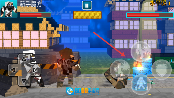 2、在战斗过程中,通过左下角的十字键来操控角色移动,利用右侧的技能/攻击键进行输出。与队友“新手魔方”协同作战,针对建筑场景中的敌人施展连招,以此来削减其血条。