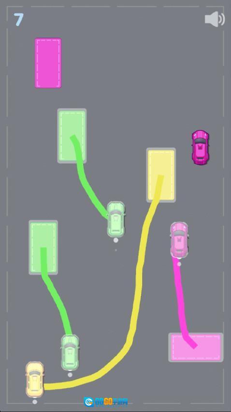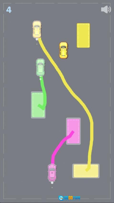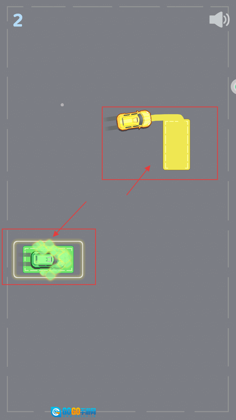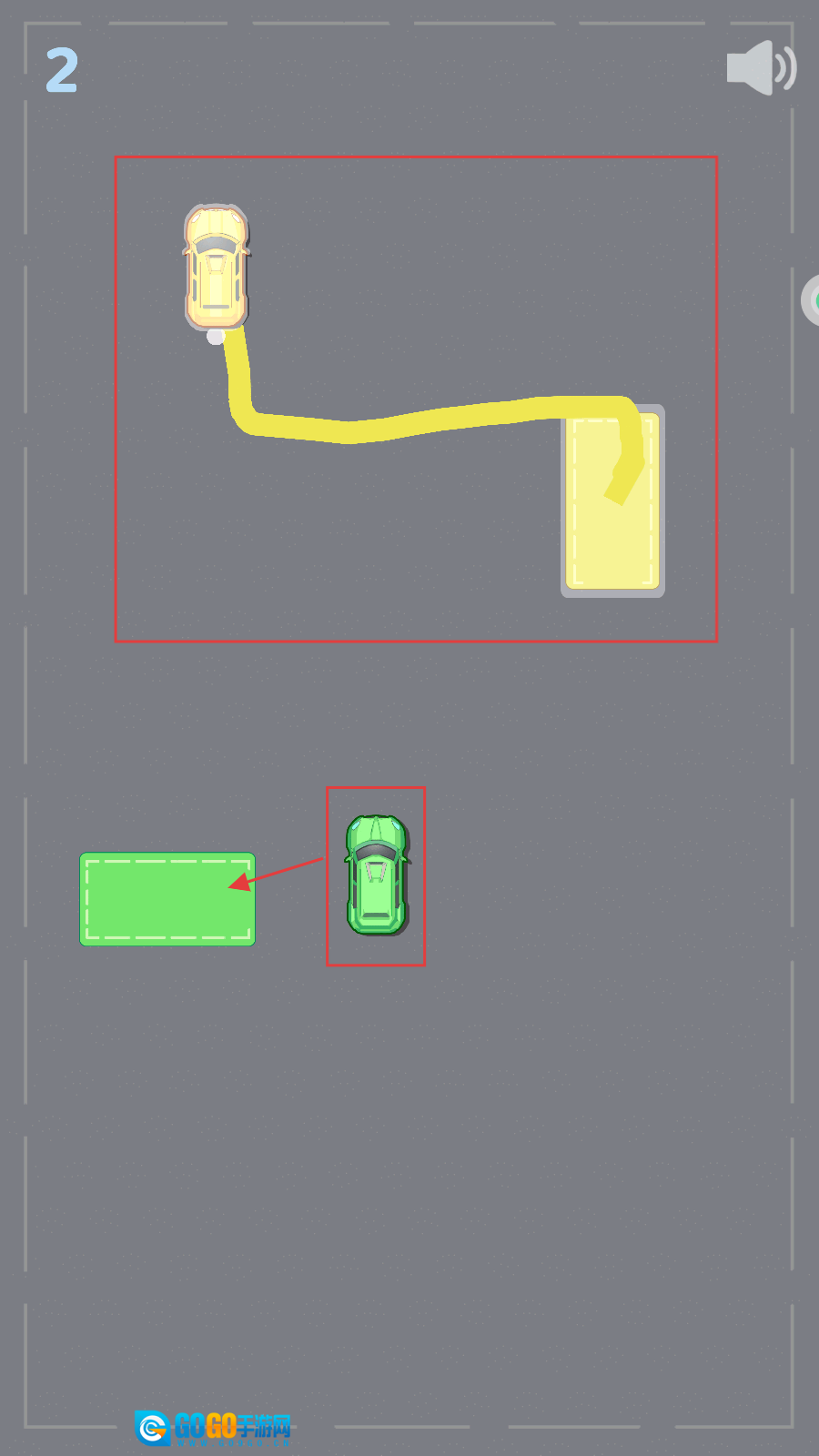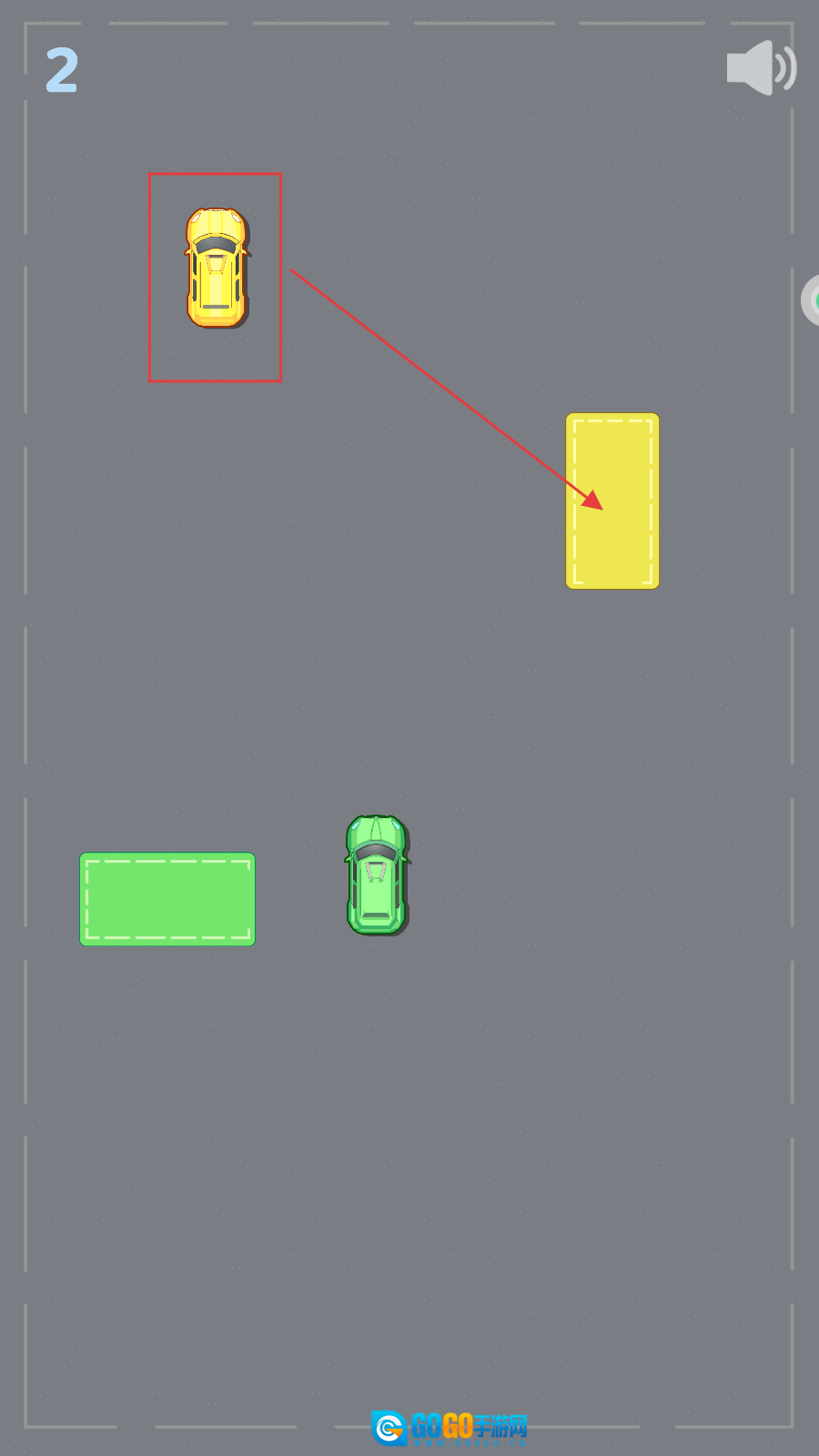 1. 来到游戏第2关,首先操控黄色小车,观察黄色车位的朝向,从而规划其行驶路线。