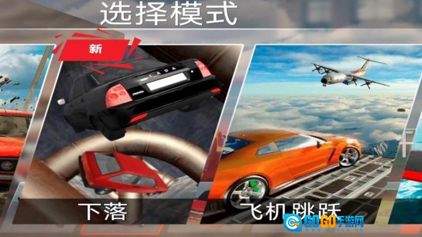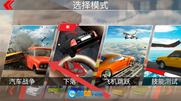 2、当前处于选择模式的页面,包含汽车战争、下落、飞机跳跃等选项,按照提示点击第1个即可进入场景开始游玩。
