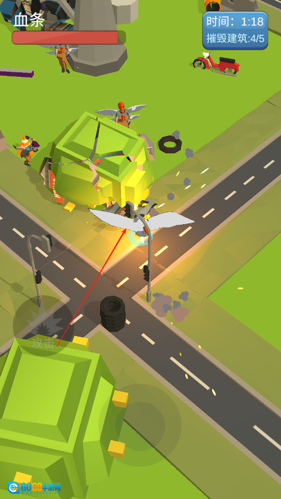 1、通过中间摇杆来操控大鹅移动,若直接冲撞建筑,上方血条值会被扣减,切不可横冲直撞,以免造成任务失败。