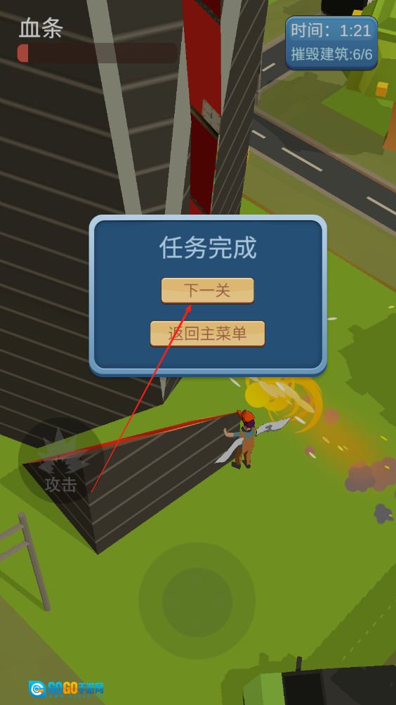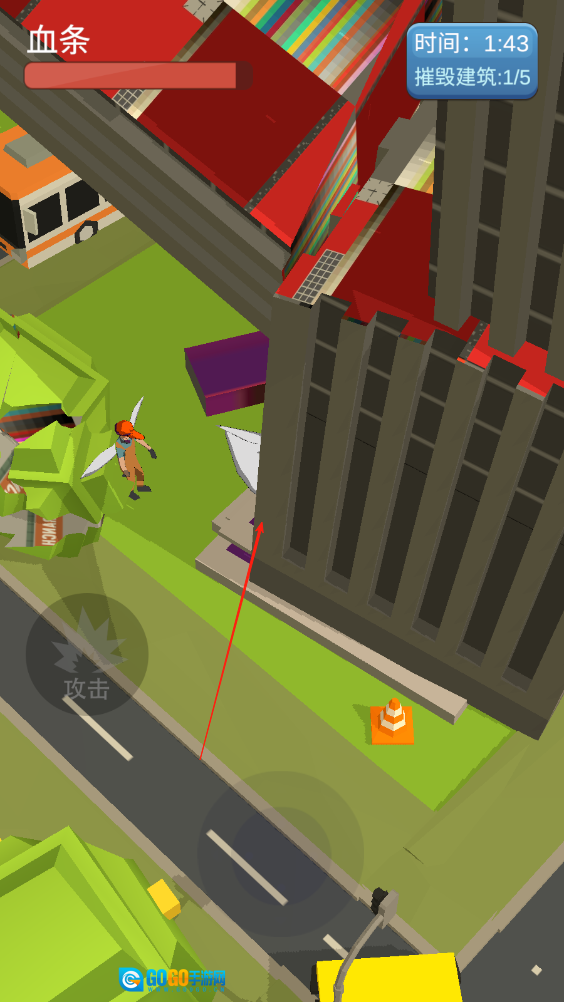 2. 于城市场景中自由行动,留意右上角的摧毁任务,当撞击建筑时点击攻击,就能撞毁该建筑。