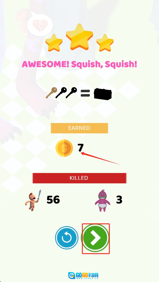 3、完成关卡结算后,轻点底部的绿色箭头按钮,即可进入下一关。在这个过程中,你能够积攒金币并记录击杀情况,进而挑战更为复杂的场景。