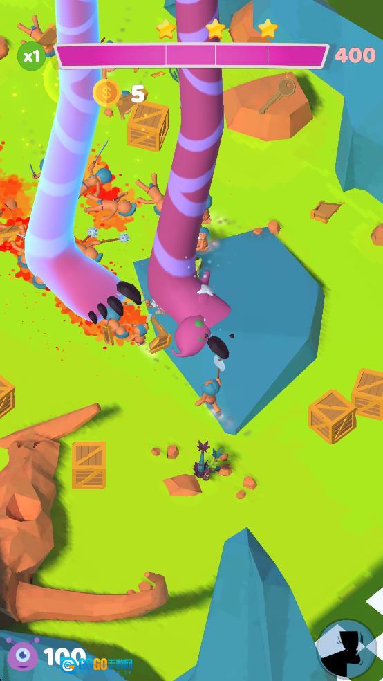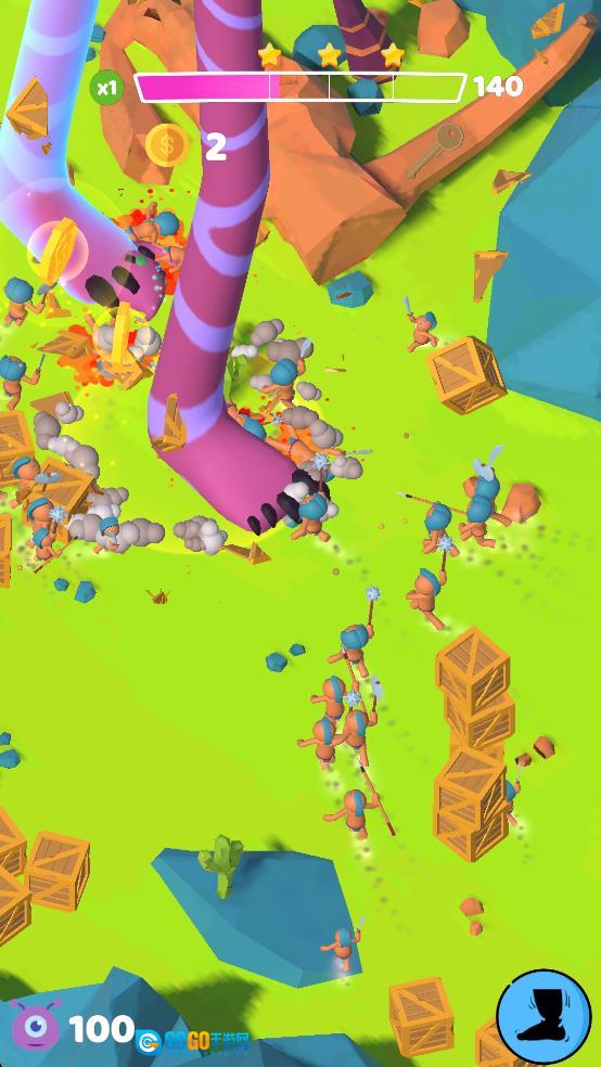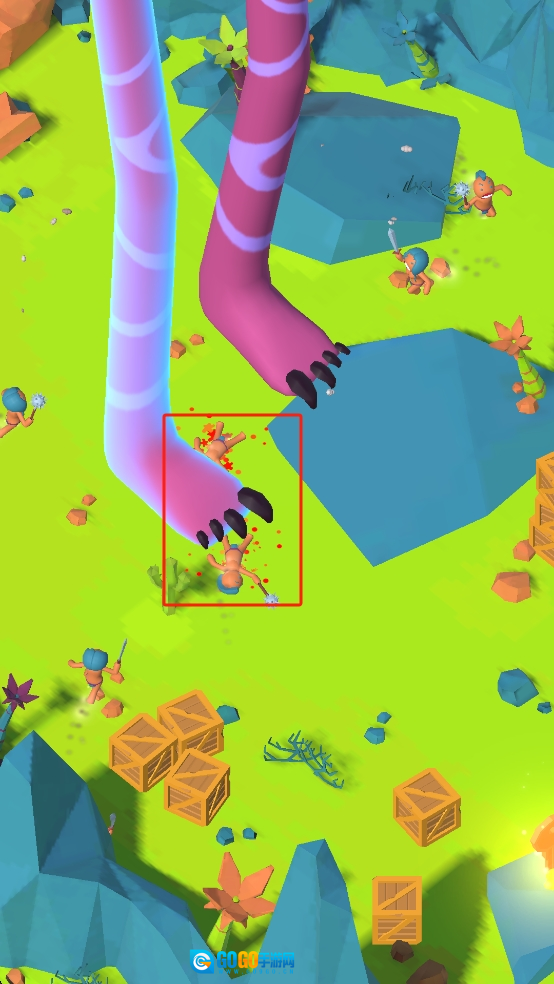 2、按顺序操控怪物的双腿移动,利用大脚踩踏地面上的小人敌人,借助碾压的方式增加击杀数量,推动关卡进程。