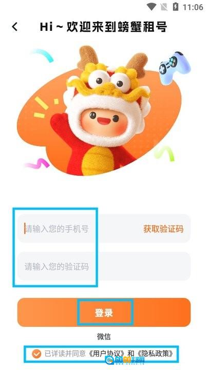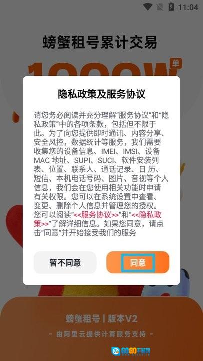 ·在本站网页打开螃蟹租号,阅读弹出的隐私政策与服务协议,点击【同意】。