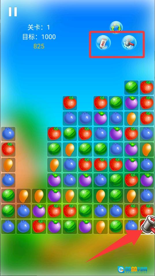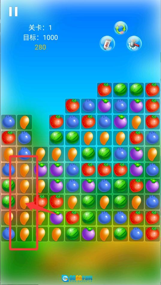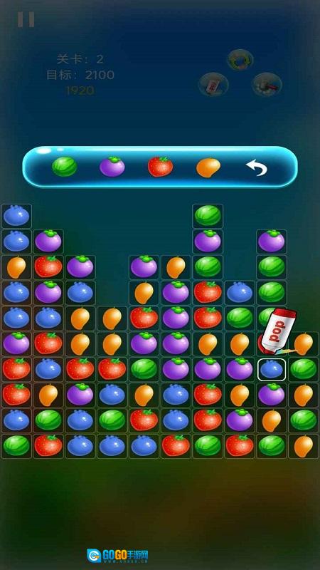 2、专注盯着屏幕,寻找相同的水果,若有三个及以上水果相连,即可点击消除。消除的数量越多,分数增长速度越快,只要达到设定目标,就能顺利过关。