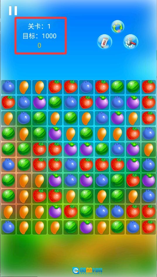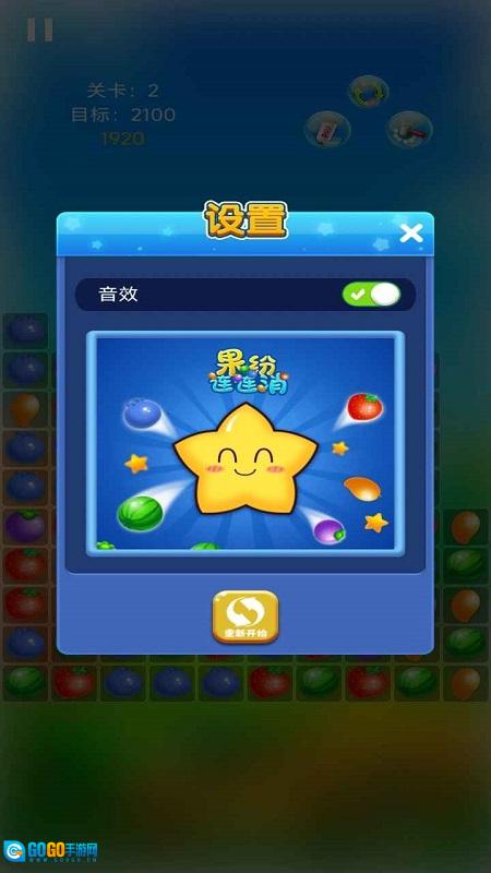 1. 打开游戏后,直接点击开始按钮,选好难度即可进入游戏。每一关需要消除的水果种类与数量都有所不同。
