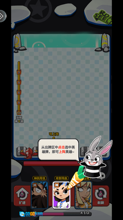 咱们先熟悉一下游戏操作,在出牌区点击英雄即可上阵。