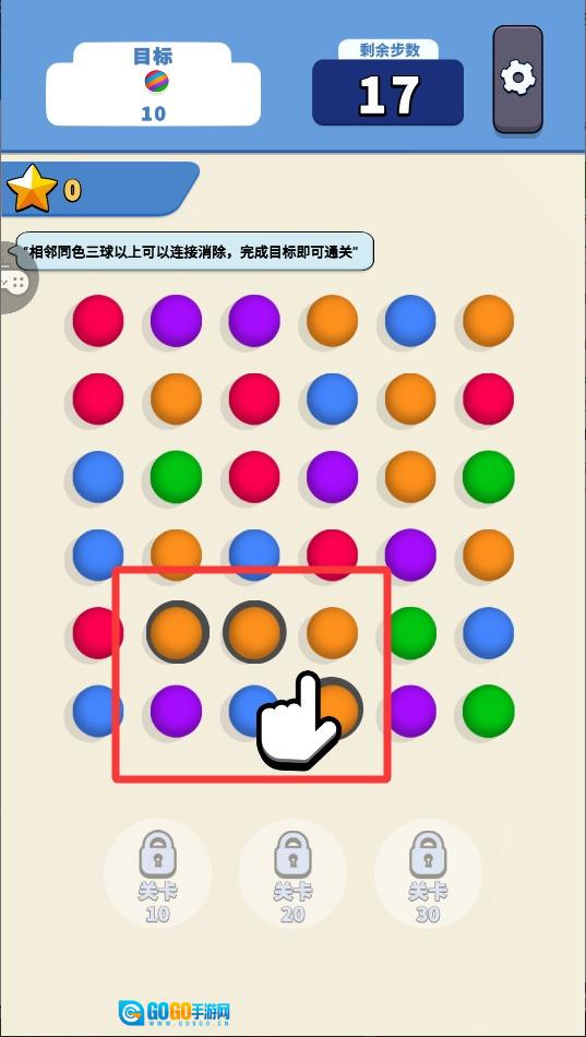 2、只需在屏幕上横向或竖向滑动手指,将相同颜色的球球聚集达到三个及以上,即可实现消除。相连消除的球球数量越多,分数加成也就越高。