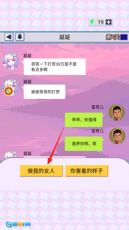 3、聊到此处,会出现两个选项,分别是“做我的女人”和“你害羞的样子”。选择其中任意一个,富贵儿都会说出相应台词,而凝凝也会因不同选择给出不一样的回应,进而影响对话的走向以及两人关系的发展。
