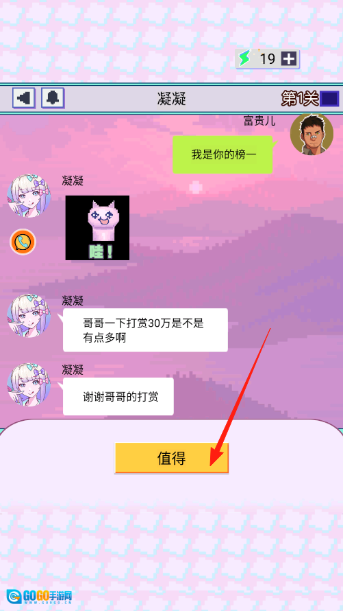 2、在聊天框中,凝凝说完话后,会出现“值得”按钮。点击该按钮,富贵儿便会回复相应的话语,从而推动这段对话的进行。而且,每选择一个回复,都能看到凝凝产生新的反应,使得聊天可以持续下去。