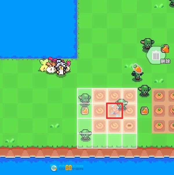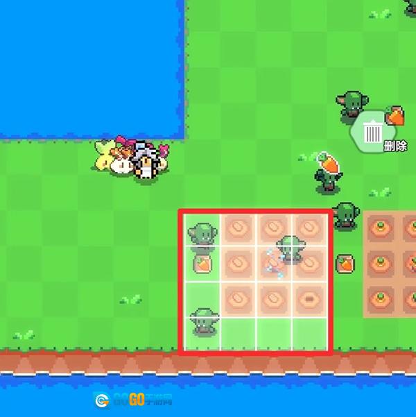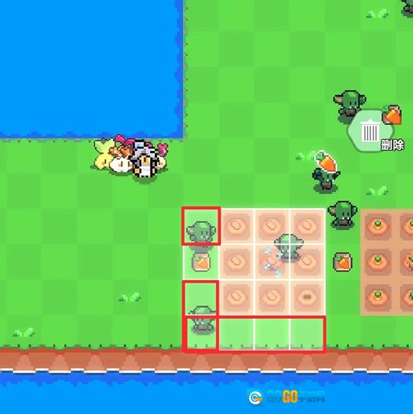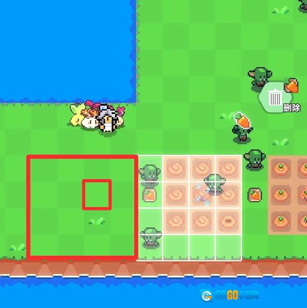 5、假定我们需把农作物挪动到图里红色大方块区域,那么洒水器应当处于红色小方块区域。