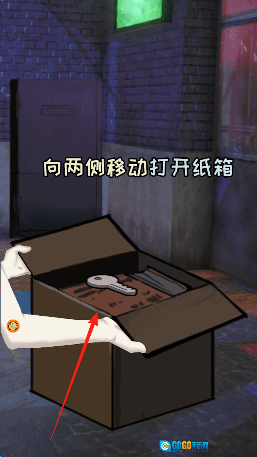3、依照提示【向两侧移动打开纸箱】,在屏幕两侧滑动拉开箱子,获取红箭头所指的钥匙,用这把钥匙打开对应的门锁,推动解谜进程。需留意场景为病院走廊,尽情体验密室逃脱。