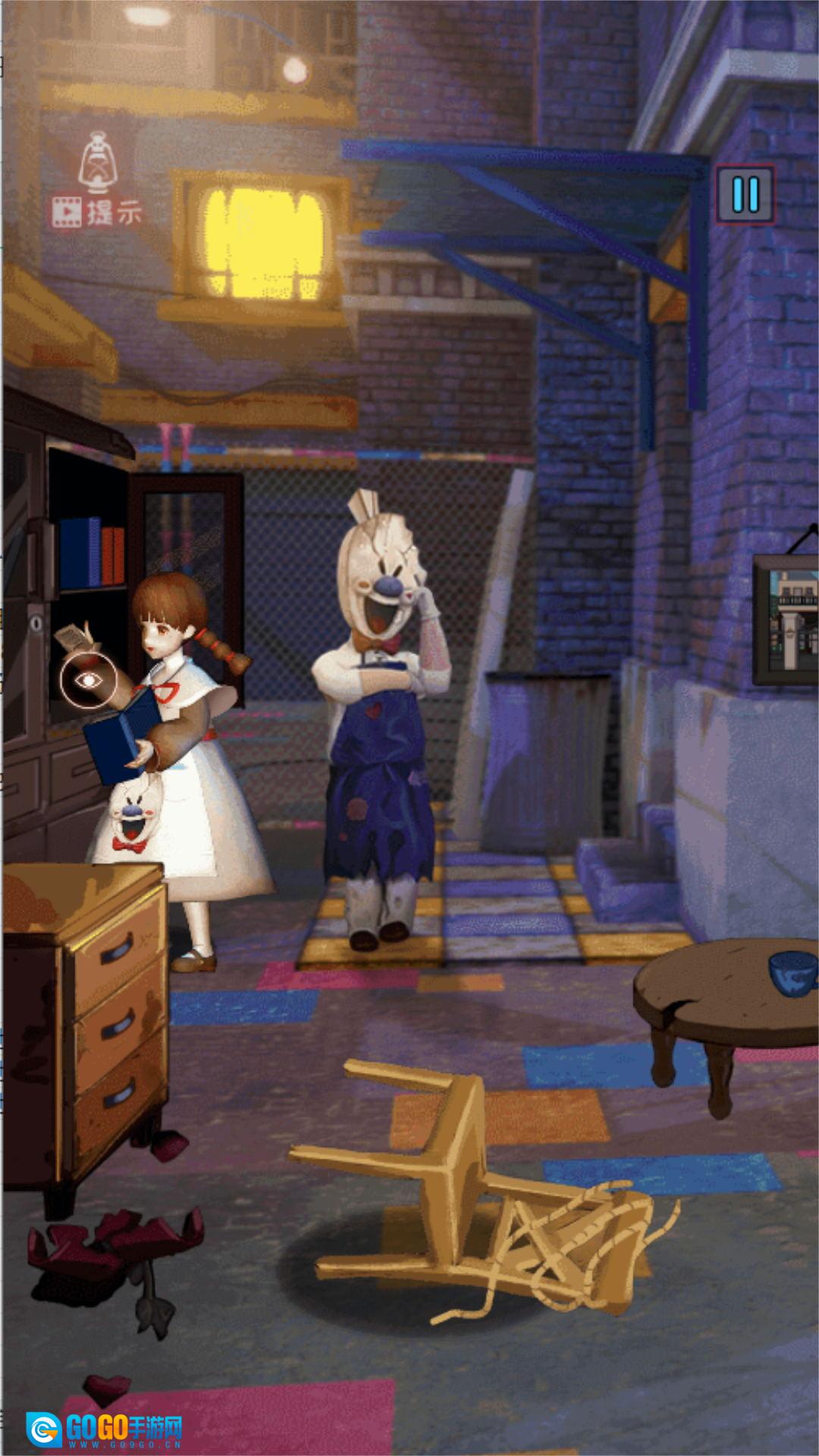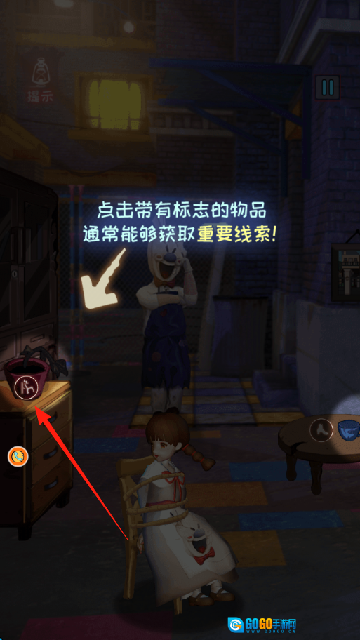 1. 踏入场景后,依照提示【点击带有标志的物品往往能获取关键线索】,红箭头指向花盆,点击进行互动,获取线索道具,推动解谜进程,同时留意小丑。