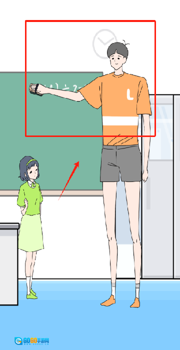 3、瞧,教室里那个高个子男生正拿着黑板擦指着黑板,顺着红色箭头所指的方向看去,要留意他们两人之间的互动提示。