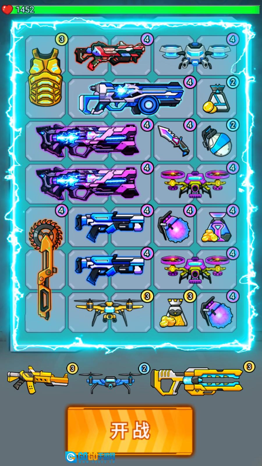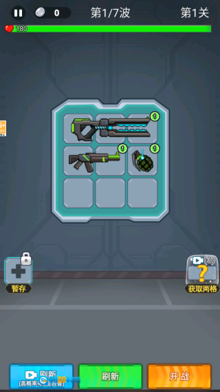 1. 进入游戏后点击“开始”,把武器拖到指定的格子里,相同的武器能够合成升级。完成装备放置后,正式开启对战。