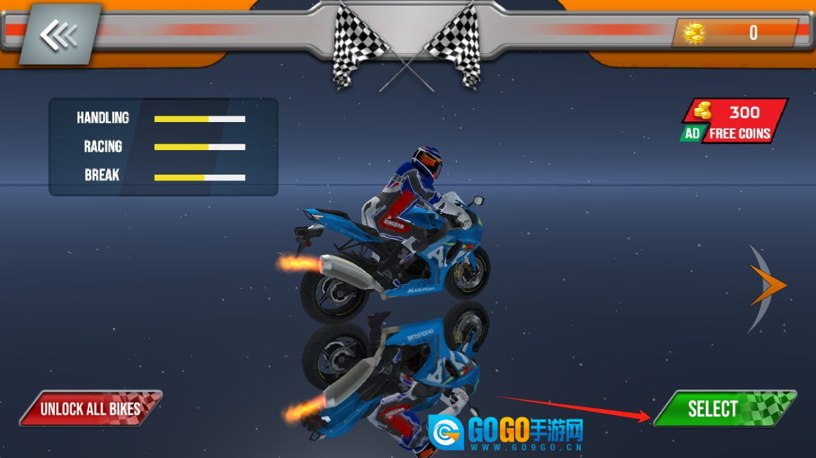 2、当进入车辆选择界面,仔细查看各类车辆在操控、竞速以及刹车方面的性能表现,从中挑选出合适的摩托车,随后点击“SELECT”进行确认。