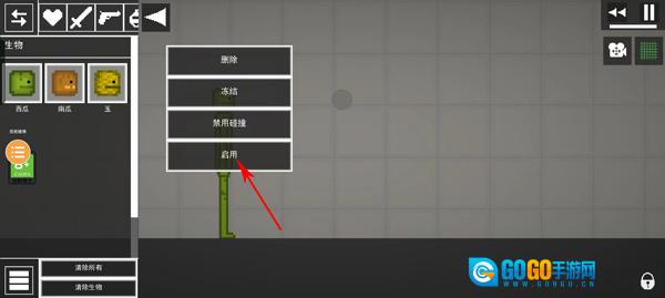3、接着抬起胳膊,双击西瓜角色的胳膊,此时会弹出删除、冻结、静置碰撞、启用等选项,选择冻结,胳膊便会停止动作。