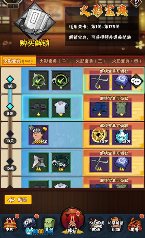 4、完成关卡后,就能解锁宝典奖励,领取装备、忍者碎片之类的奖励。