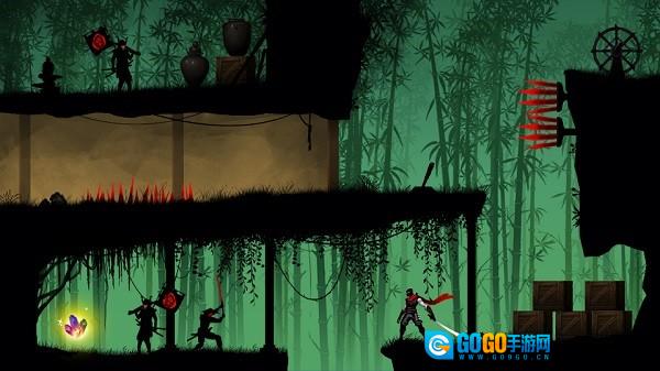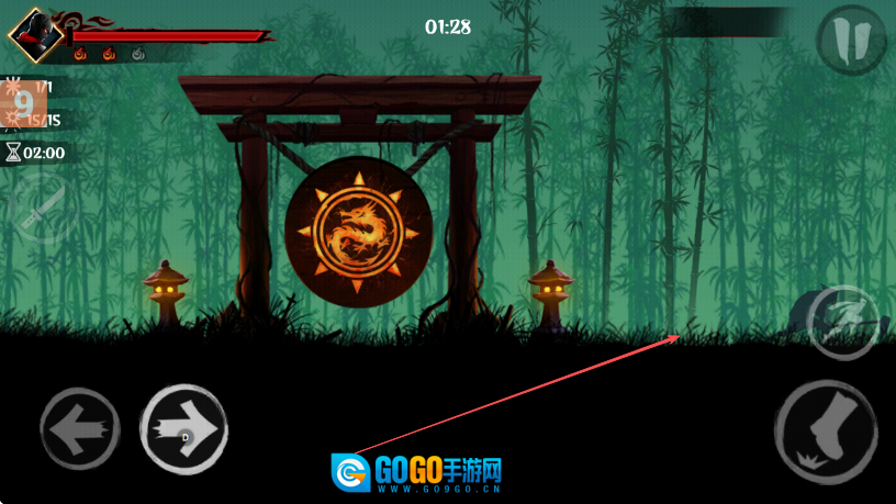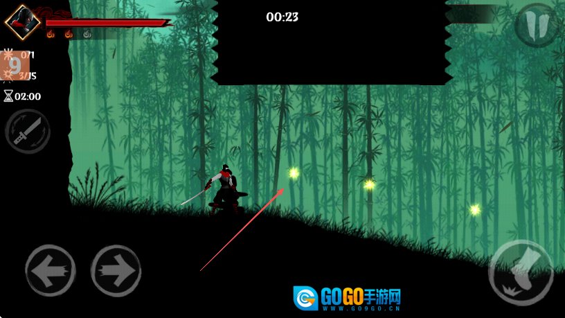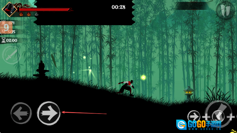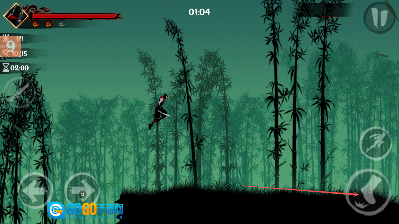 1. 游戏开启后,利用屏幕左下角的左右方向键来控制忍者移动,对竹林场景展开探索。