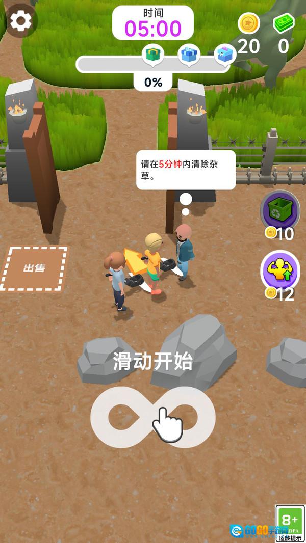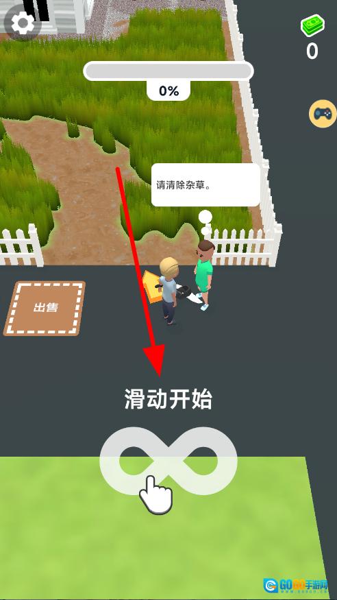 1、新手玩家开启体验之旅,第一步,滑动开始按钮,启动割草任务,随即进入割草操作环节,此环节旨在为后续获取资源奠定基础。
